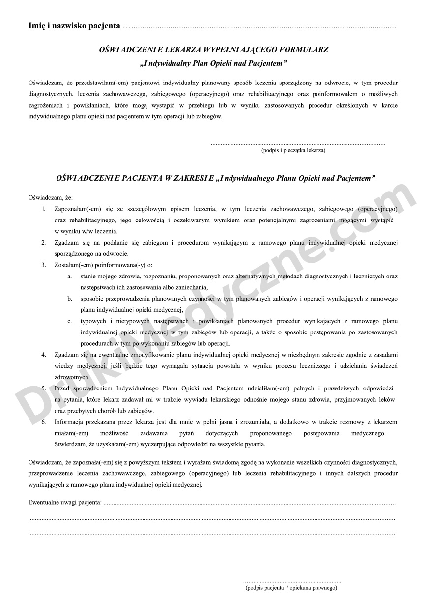Indywidualny Plan Opieki nad Pacjentem to profesjonalny druk w formacie A4. Formularz spełnia wymogi dokumentacji medycznej zgodne z obowiązującymi przepisami. Personel medyczny stosuje go na co dzień w pracy z pacjentem.