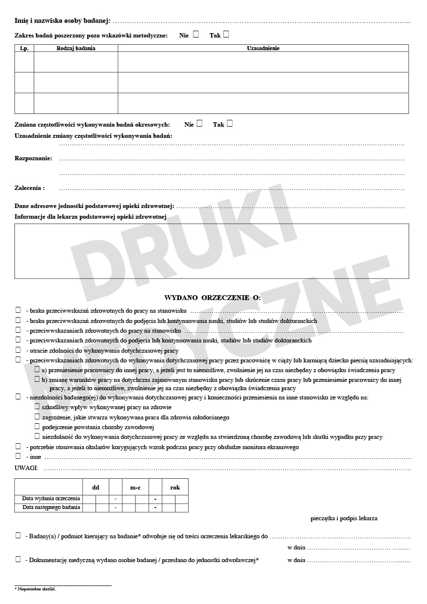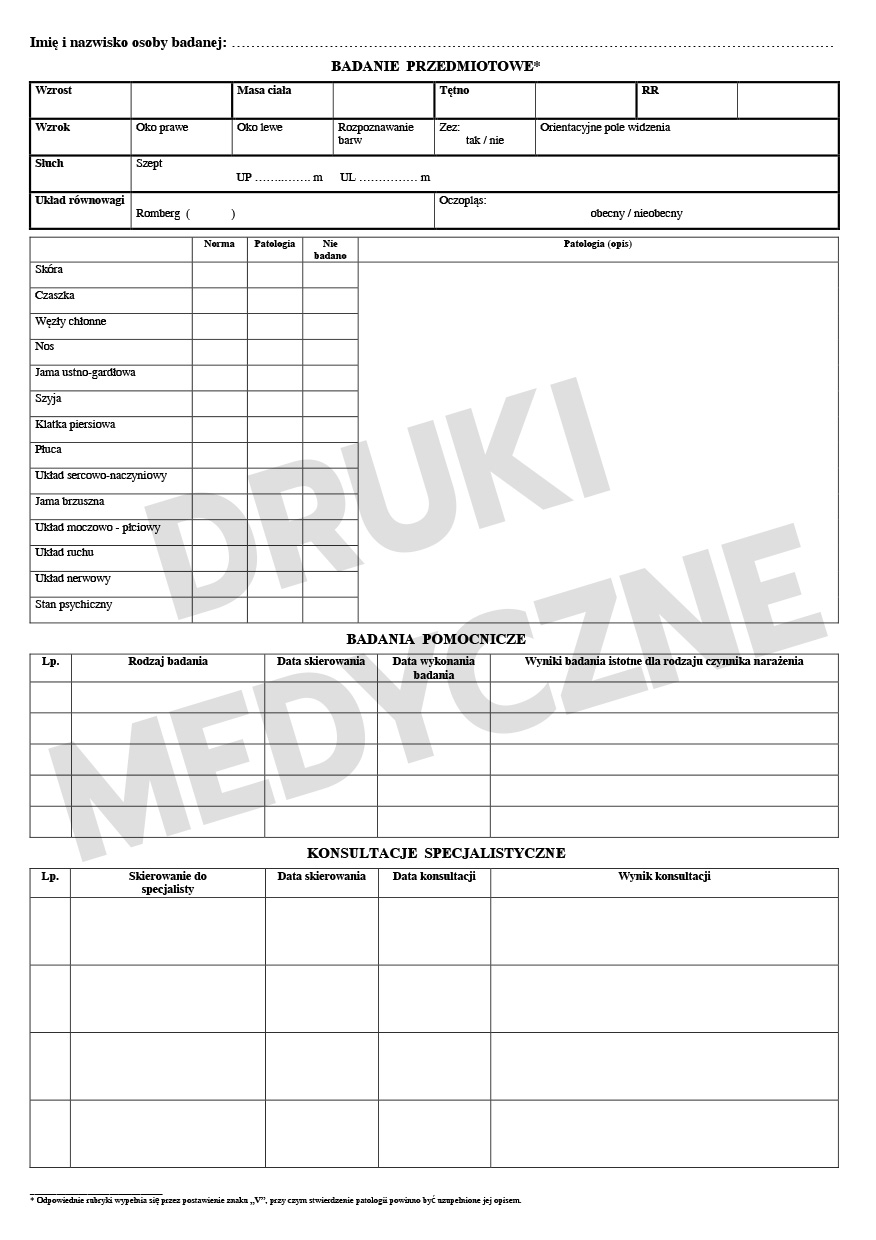 Druk jest zgodny z obowiązującymi przepisami BHP i stosowany podczas badań wstępnych, okresowych oraz kontrolnych pracowników. Dzięki dużemu formatowi A3 karta zapewnia wygodę uzupełniania danych, a składanie do A4 umożliwia łatwe przechowywanie w dokumentacji medycznej.