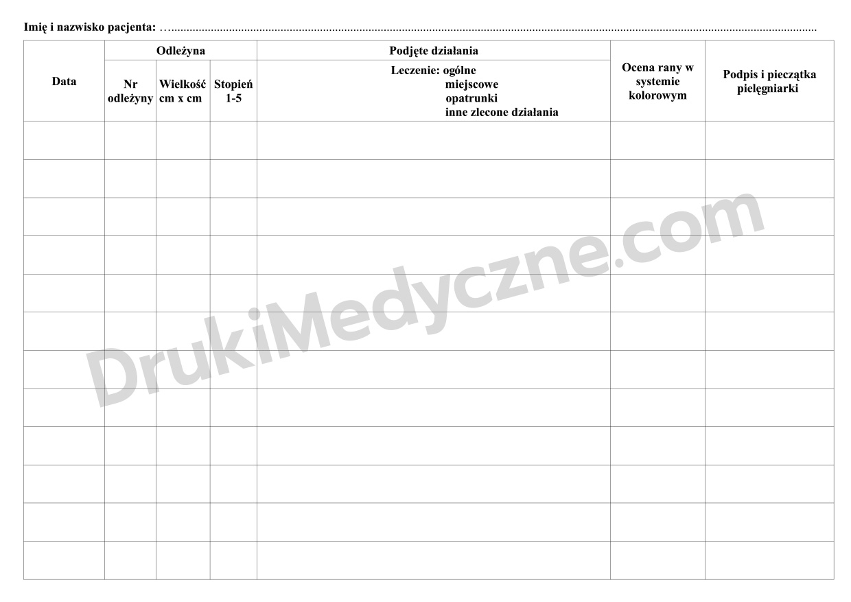 Druk zawiera sekcje na dane pacjenta, datę przyjęcia oraz informację o występowaniu odleżyn. Personel wpisuje numer odleżyny, jej wielkość i stopień zaawansowania. Formularz dokumentuje podjęte działania — leczenie ogólne, miejscowe, opatrunki oraz ocenę rany w systemie kolorowym.