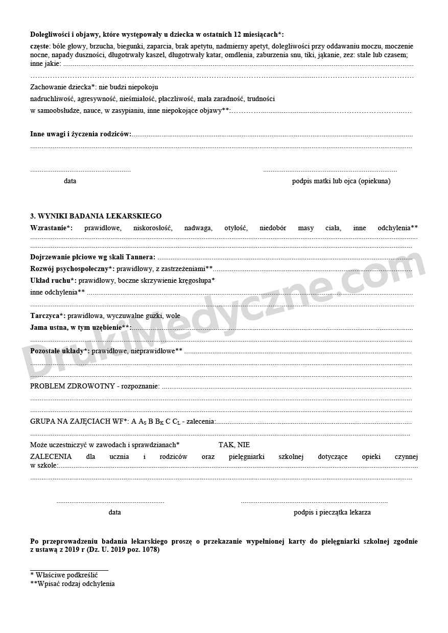 Druk zawiera sekcje na dane ucznia, wyniki badania pielęgniarskiego oraz informacje rodziców. Pielęgniarka wpisuje dane o rozwoju fizycznym, wzroku, układzie ruchu i ciśnieniu tętniczym. Lekarz dokumentuje wyniki badania lekarskiego i zalecenia dotyczące zajęć WF.