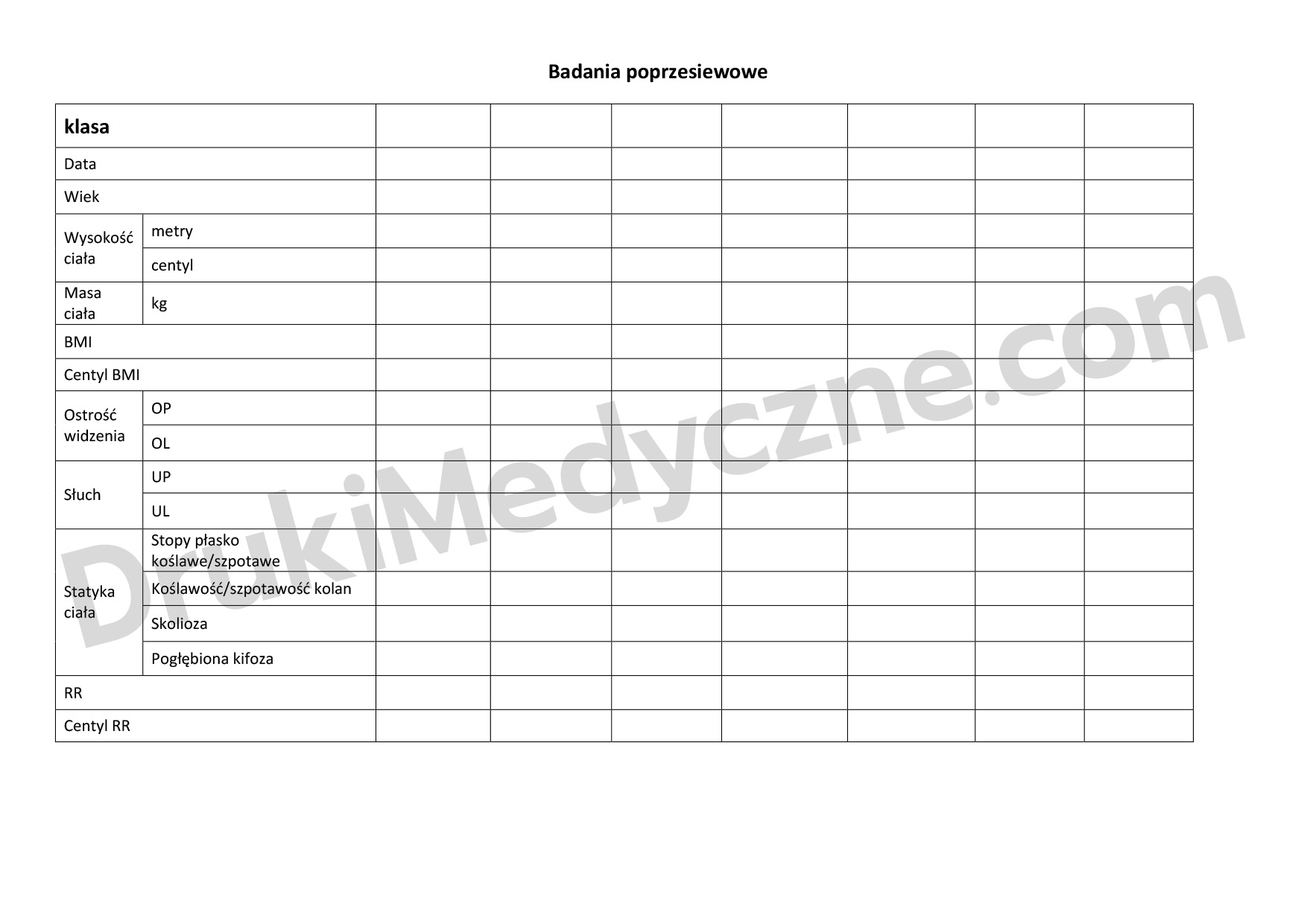 Testy przesiewowe ucznia druk to profesjonalna karta medyczna. Wykorzystuje ją pielęgniarka szkolna lub higienistka szkolna do dokumentowania wyników badań przesiewowych. Karta obejmuje wszystkie etapy edukacji – od oddziału przedszkolnego do 19 roku życia. Ponieważ zawiera zarówno testy przesiewowe, jak i badania poprzesiewowe, umożliwia prowadzenie kompletnej dokumentacji zdrowotnej ucznia w jednym miejscu.